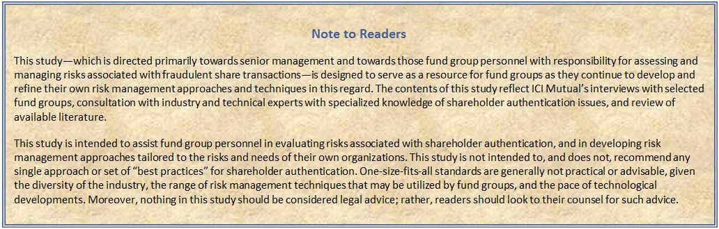 Fund groups have long sought to protect the integrity of transactions effected by fund shareholders, whether effected by traditional means (e.g., in writing, by telephone) or by newer means (e.g., online, via mobile apps). But the digital age has added to the challenges, and for many fund groups, these challenges have underscored the importance of “shareholder authentication”—that is, of having appropriate mechanisms and processes in place (1) to confirm the identities of shareholders who seek to conduct redemptions or other transactions involving fund shares, and (2) to ensure the integrity of the transactions that are effected by those fund shareholders.